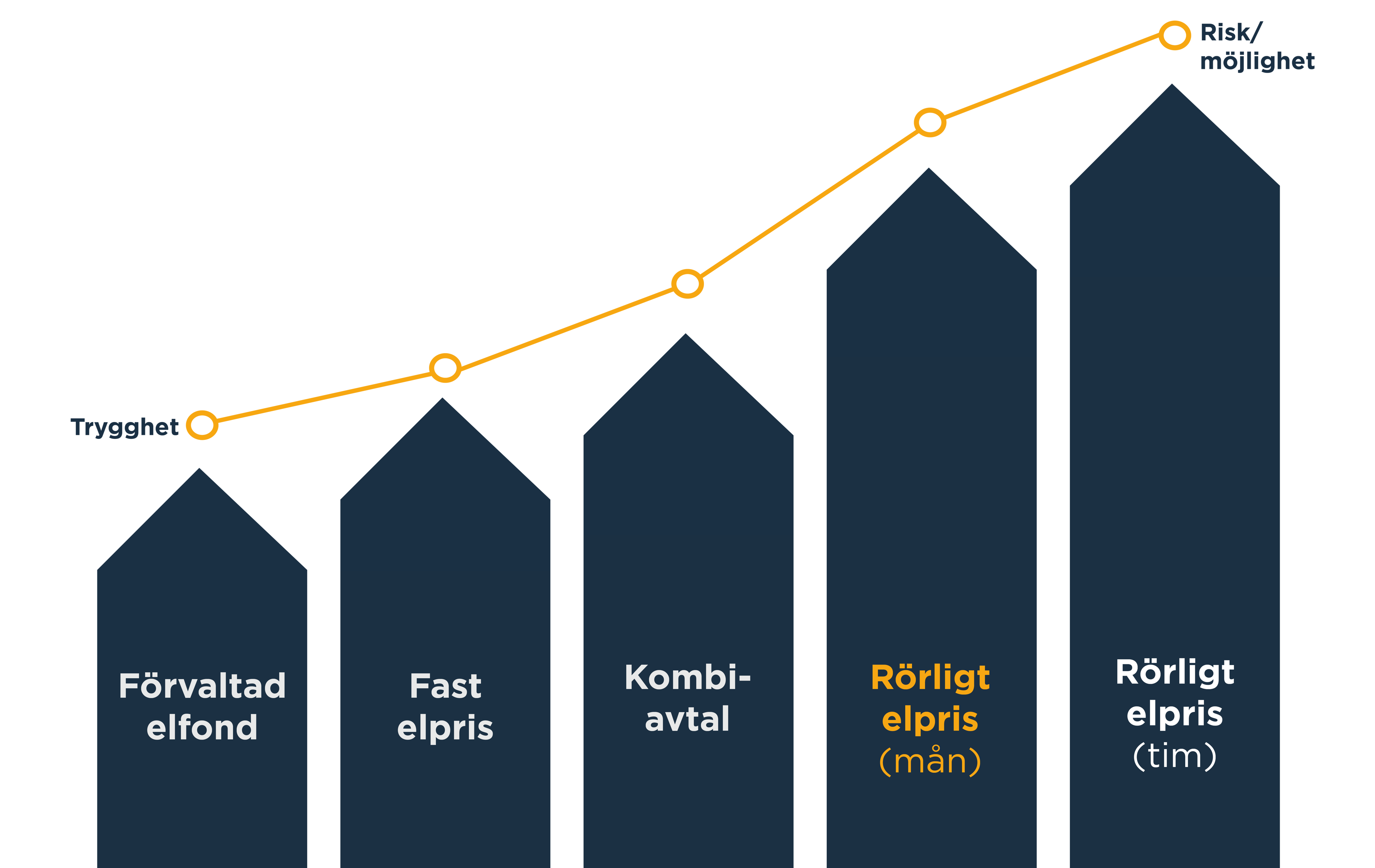 Att ha ett rörligt elavtal innebär att kostnaden för den el du använder förändras och följer elmarknadens både upp- och nedgångar. Rörligt elpris passar bra för verksamheter där elprisets påverkan på företagets produkt eller tjänst är liten. Eller verksamheter där det inte finns något behov av att mer detaljerat budgetera för elkostnader. Rörligt elpris kan vara aktuellt för såväl den lilla elförbrukande verksamheten som den med betydligt större elåtgång. För mätare med månadsavräkning sker prissättning enligt volymvägt månadsmedelspotpris och för mätare med timavräkning. sker prissättning enligt timspot.
